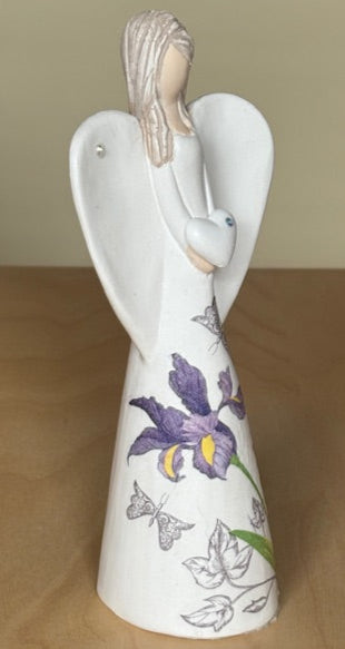 💙 Anjel moderný s dekoratívnym fialovým kosatcom – Symbol nádeje a duchovnej hĺbky